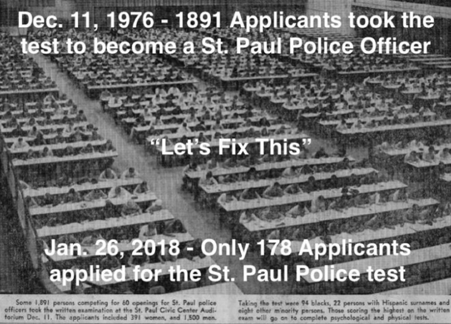 In 1976—one year before today’s standards were put in place—the Saint Paul Civic Center was filled with 1,891 applicants taking the test to become a police office. This year 178 eligible persons applied. In the above picture, there are two future law enforcement and community leaders—Saint Paul Police Chief John Harrington and Ramsey County Sheriff Bob Fletcher. Neither of these two would be able to take the test with today’s limitations.